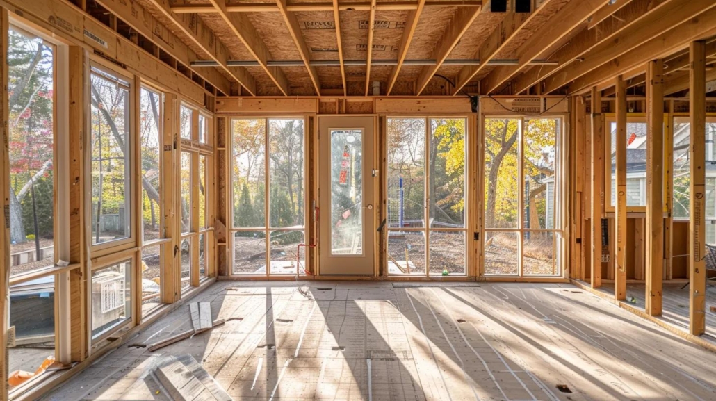 Sunroom under construction with wooden framing, large windows, and a door, showcasing natural light and surrounding outdoor scenery.